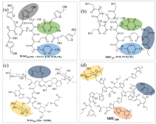 基于此背景,团队对高浓生物质葡萄糖基于酸催化醇解制备乙酰丙酸酯的反应行为、产物形成以及过程机理进行了深入研究。对比发现当葡萄糖底物浓度从20g/L提高至200g/L,会极大促进可溶性低聚物的生成,而固体腐殖质的生成量基本不变。当底物浓度升高后,反应初始阶段葡萄糖的自聚合反应会加剧,同时反应中间产物浓度的升高也会促使化学平衡偏向可溶性低聚物的形成,从而导致目标产物乙酰丙酸酯的得率降低。研究进一步对不同底物浓度葡萄糖反应生成的可溶性低聚物和固体腐殖质的结构特点进行了系统表征,获得了相应物质的化学结构模型,阐明了高浓葡萄糖醇解的反应过程机理。研究结果可为高浓生物质糖催化转化选择性制备高值能源化学品的途径开发与策略构建提供基础理论指导。