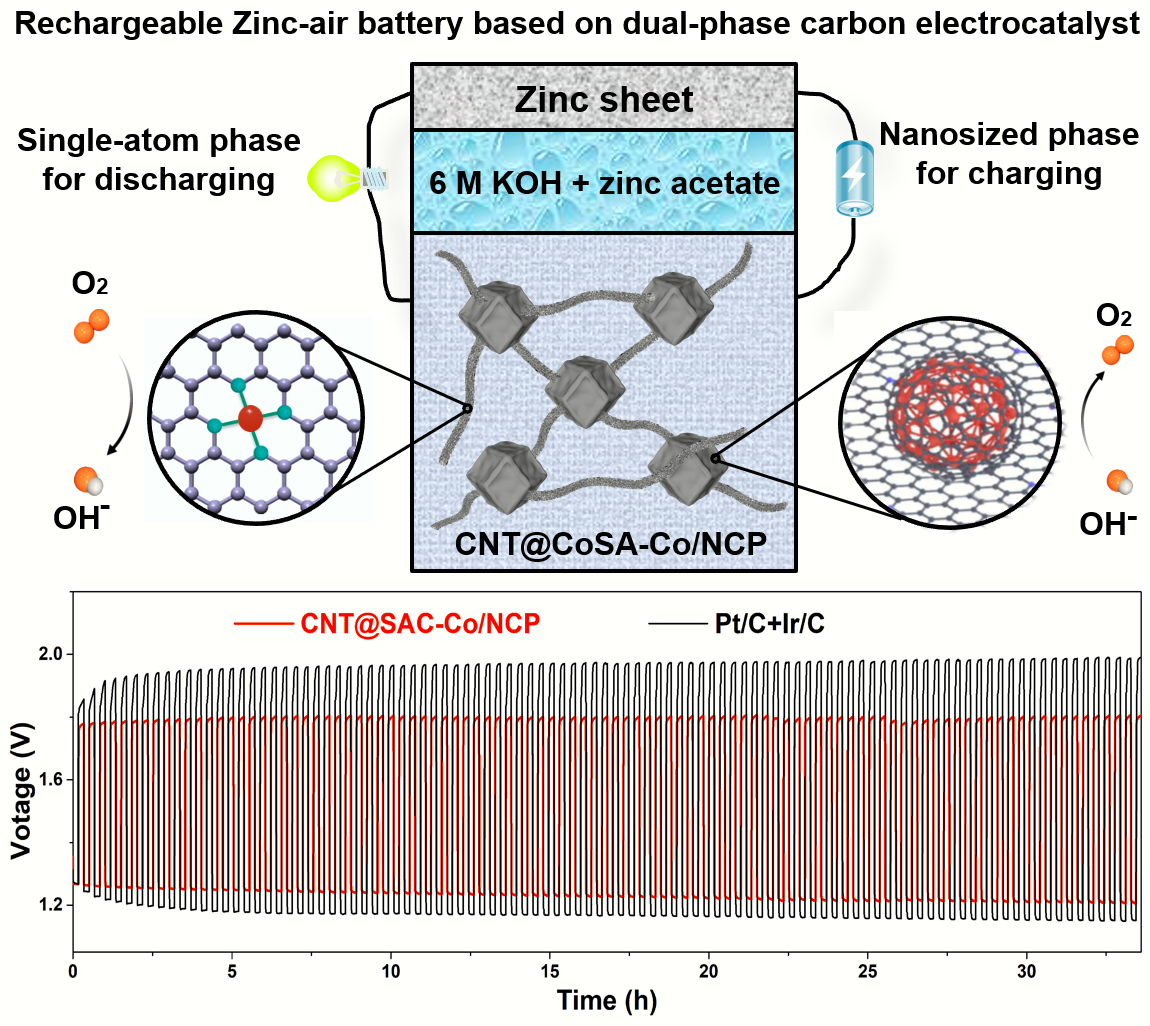 星力 磷化工团队李金成教授联合中科院金属所刘畅研究员和香港科技大学邵敏华教授等人提出了双相碳催化剂的概念,将单原子催化剂和纳米催化剂的优势结合起来,合成了CNT@SAC-Co/NCP双功能氧催化剂。其中,CNT@SAC单原子相在放电过程中催化ORR,Co/NCP纳米颗粒相在充电过程中加速OER,它们通过高导电性CNT相连,这种“既独立又关联”的结构可以有效降低ORR单原子位点配位结构在强氧化环境(OER过程)中破坏而导致性能的急剧衰减。基于此,以CNT@SAC-Co/NCP为双功能氧催化剂,组装的可充放电锌空电池表现出优异的输出性能(功率达到172 mW cm-2;充放电电压差为0.51 V@5 mA cm-2)和恒流充放电循环稳定性能。