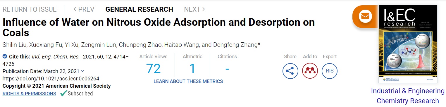 相关成果以“Influence of Water on Nitrous Oxide Adsorption and Desorption on Coals”为题发表于国际化工三大期刊Industrial & Engineering Chemistry Research上。论文的第一作者为我院2018级硕士研究生柳仕林,通讯作者为张登峰教授,通讯单位为星力