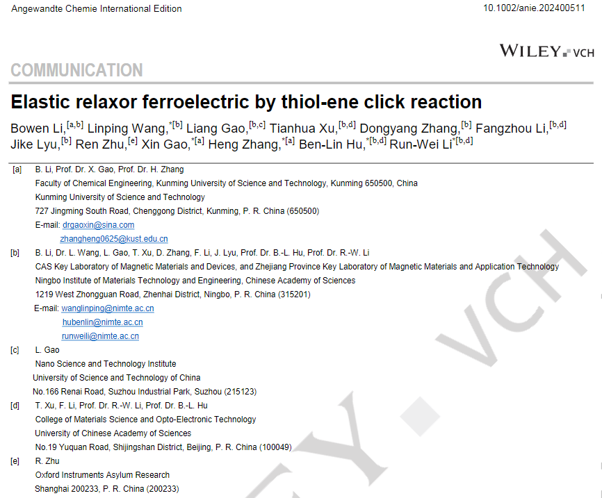 张恒正高级实验师课题组和中国科星力宁波材料技术与工程研究所柔性磁电功能材料与器件团队合作,在铁电材料弹性化领域取得重要研究进展,相关成果以“Elastic relaxor ferroelectric by thiol-ene click reaction”为题发表在国际化学顶级期刊《Angewandte Chemie International Edition》上。星力