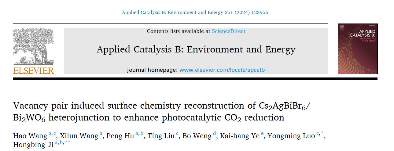 先进环境功能材料罗永明教授团队联合中山大学纪红兵教授团队围绕二氧化碳催化转化制备甲烷反应中缺陷限域型异质结催化剂设计的最新研究成果“Vacancy pair induced surface chemistry reconstruction of Cs2AgBiBr6/Bi2WO6heterojunction to enhance photocatalytic CO2reduction”在环境催化领域著名学术期刊Applied Catalysis B: Environmental and Energy(IF=22.1)发表。论文第一作者是我院王皓博士,通讯作者为罗永明教授和纪红兵教授。