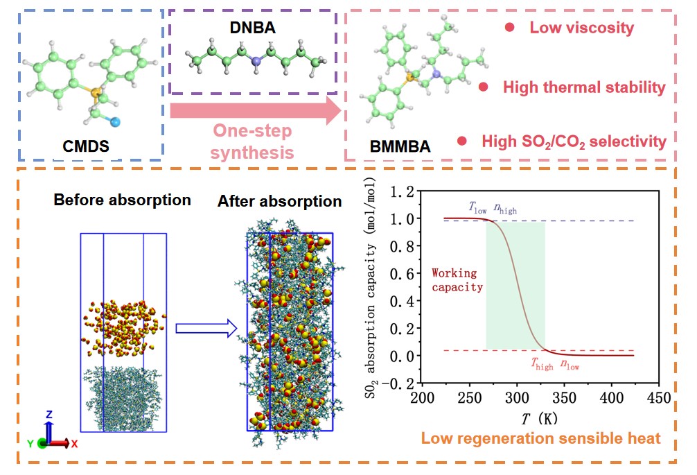 分子分离与催化团队通过合成胺烃基硅烷吸收剂与新型金属氧化物吸附剂制备了高性能的SO2吸收、吸附剂。通过物性、吸收性能、机理和热力学分析等研究表明:胺烃基硅烷展现出低粘度、高热稳定性以及低再生显热的特点,金属氧化物如MnO对SO2可以达到等摩尔吸附的高吸附容量。该研究发现可为设计高效、低能耗的SO2捕集介质提供理论基础。