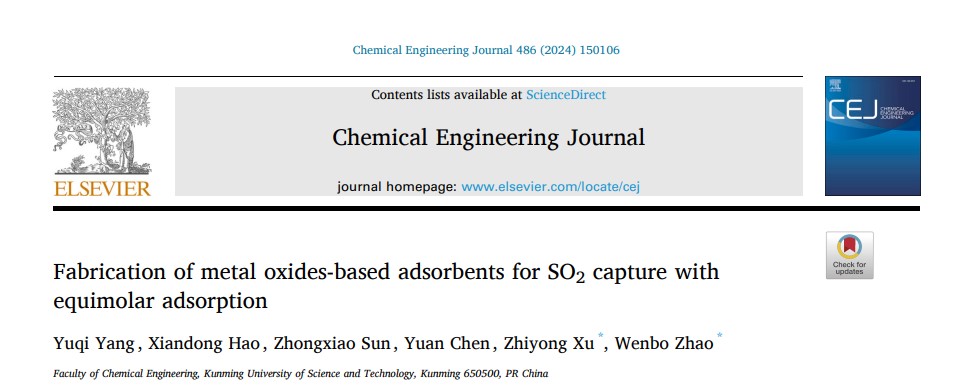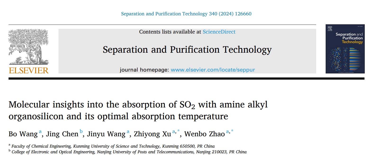 分子分离与催化赵文波教授团队在SO2气体捕集领域取得新研究进展。相关成果以“Molecular insights into the absorption of SO2with amine alkyl organosilicon and its optimal absorption temperature”和“Fabrication of metal oxides-based adsorbents for SO2capture with equimolar adsorption”为题分别发表在化工一区TOP学术期刊《》和《Chemical Engineering Journal》上。