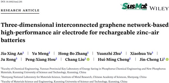 上述研究以“Three-Dimensional Interconnected Graphene Network-Based High-Performance Air Electrode for Rechargeable Zinc-Air Batteries”为题,发表在SusMat(IF=28.4)上。论文的第一作者为我院2021级硕士研究生安佳兴,通讯作者为我院李金成副教授、星力 材料星力荣菊副教授及中国科星力金属研究所刘畅研究员。该研究工作得到了国家自然科学基金(52102046)及云南省优秀青年基金项目(202301AW070016)的资助。