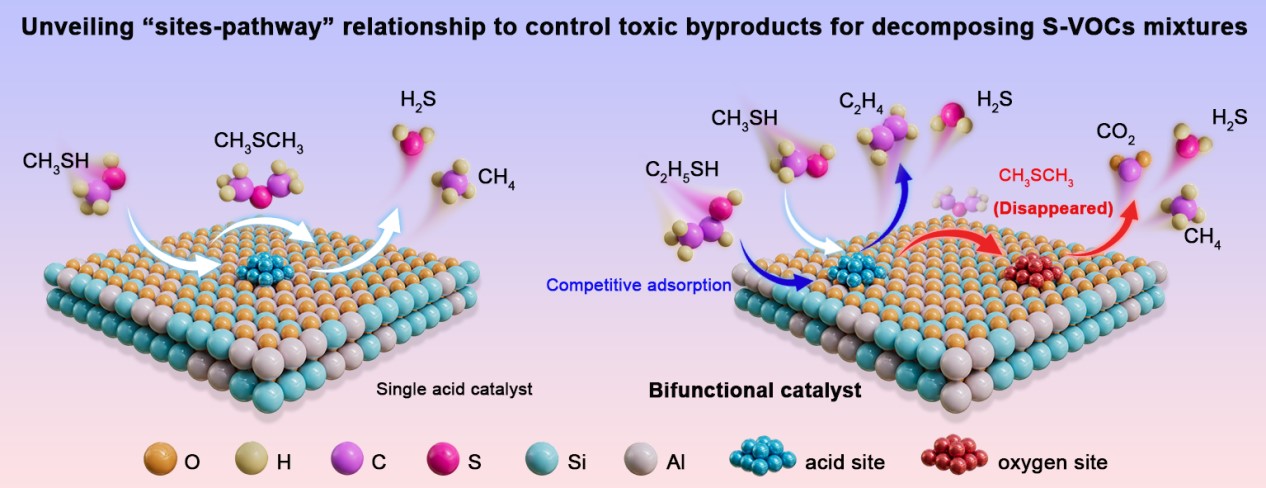 罗永明教授团队提出一种竞争吸附耦合双功能位点的催化策略,即引入新的含硫VOCs物种-乙硫醇,与反应中间体甲硫醚形成竞争吸附,通过构建拥有酸位点和氧位点的双功能催化材料,将原本优先吸附在酸位点上的甲硫醚诱导到氧位点,通过氧位点形成活化能更低的新反应路径加速甲硫醚的消耗,从而实现二次恶臭污染物的高效消除和达标排放。该策略对于实际环境中混合多组分含硫VOCs及其二次污染控制具有重要的理论价值和现实意义。