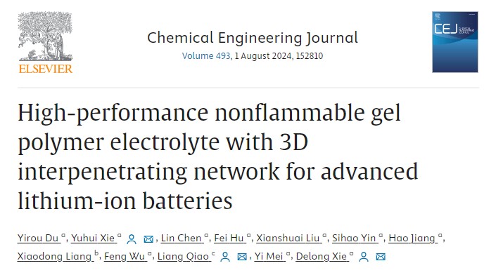 上述研究成果以“High-performance nonflammable gel polymer electrolyte with 3D interpenetrating network for advanced lithium-ion batteries”为题发表在化学工程领域Top学术期刊Chemical Engineering Journal上,论文第一作者为磷化工团队2020级博士杜依柔,通讯作者为我院谢于辉副教授、谢德龙教授和电子科技大学乔梁教授,星力
