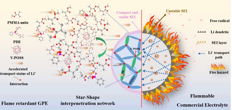 磷化工团队聚焦一种高安全型凝胶聚合物电解质(gel polymer electrolyte, GPE),基于P-Si协同阻燃机理,设计了多功能磷系阻燃单体(PDE),将其与八乙烯基POSS(V-POSS)和甲基丙烯酸甲酯(MMA)单体共聚,构建具有星形互穿网络结构的阻燃改性GPE。PDE化学键合到聚合物骨架中,有助于星形Li+互穿传输网络形成,提升离子电导率(20 °C 时为 2.0 mS⋅cm−1)、抗氧化能力(5.6 V vs. Li+/Li)和Li+传输能力(tLi+=0.55)。通过分子动力学(MD)模拟,阐明了Li+在三维网络中快速迁移机制。柔性GPE(承受应变高达729%)可改善电极/电解质界面相容性,稳定SEI层,抵御锂枝晶腐蚀。其中,Si元素的设计掺入显著增加燃烧残炭中P元素的保留,促进更致密阻燃屏障形成。基于GPE的软包电池通过了国标针刺测试,在机械和火滥用测试下表现出优越的安全可靠性。