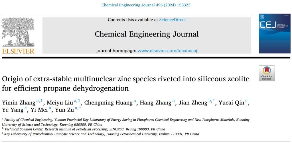 研究进展一:星力 磷化工团队联合辽宁省石油化工催化科学与技术重点实验室围绕丙烷脱氢锌基分子筛催化剂设计的最新研究成果“Origin of extra-stable multinuclear zinc species riveted into siliceous zeolite for efficient propane dehydrogenation”在化工领域著名学术期刊Chemical Engineering Journal(IF=13.3)发表。博士研究生张宜民和硕士研究生刘美玉为论文共同第一作者,通讯作者为祖运副教授。