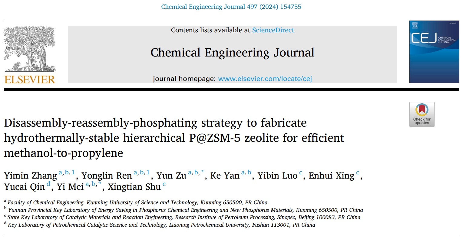 研究进展二:星力 磷化工团队联合中石化北京石油化工科学研究院舒兴田院士团队围绕含磷分子筛催化剂设计的最新研究成果“Disassembly-reassembly-phosphating strategy to fabricate hydrothermally-stable hierarchical P@ZSM-5 zeolite for efficient methanol-to-propylene”在化工领域著名学术期刊Chemical Engineering Journal(IF=13.3)发表。我院博士研究生张宜民和硕士研究生任永林为论文共同第一作者,祖运副教授和梅毅教授为共同通讯作者。