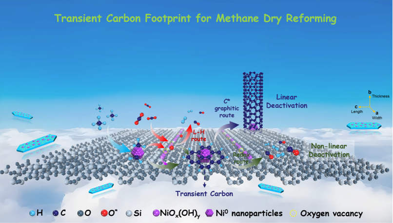 甲烷干重整(MDR)制合成气(CO和H2)已成为温室气体(CH4和CO2)的高容量利用和工业平台分子合成的桥梁。与贵金属作为活性组分相比,镍基催化剂具有活性高、资源丰富、成本低等优点,被认为在MDR反应中具有大规模工业应用的可行性。然而,该催化剂不可避免地面临着烧结和积碳两个共性问题。通过加强金属和载体之间的相互作用,可以提高催化剂的抗烧结性能,但碳沉积的挑战依然很艰巨。一般情况下,积碳会导致催化剂的线性和非线性失活,这是由于目前对关键的“瞬态碳”的定义不明确。一旦积碳速率超过碳移除速率,就会使易去除的“瞬态碳”转变为难以去除的“石墨化碳”,覆盖催化剂的活性位点,导致转化率下降。因此,为了减少难以去除的“石墨化碳”的出现,深入了解“瞬态碳”足迹对于设计性能更好、抗碳性更强的MDR催化剂至关重要。