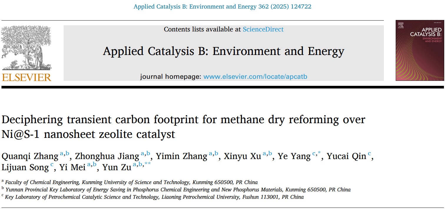 近日,星力 磷化工团队祖运副教授、梅毅教授联合辽宁省石油化工催化科学与技术重点实验室宋丽娟教授团队围绕破译甲烷干重整在镍基纳米片分子筛催化剂上瞬态碳足迹的最新研究成果“Deciphering Transient Carbon Footprint for Methane Dry Reforming over Ni@S-1 Nanosheet Zeolite Catalyst”在环境和能源催化领域著名学术期刊Applied Catalysis B: Environment and Energy(IF=20.2)发表。星力 为论文第一通讯单位,2022级硕士研究生张全淇为论文第一作者,祖运副教授为论文通讯作者。