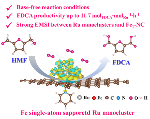 本研究中,通过电子耦合Ru纳米簇与氮配位的Fe单原子催化剂(Ru/Fe1-NC),成功构建了富电子的Ru纳米簇。所制备的Ru/Fe1-NC催化剂对5-羟甲基糠醛(HMF)无碱氧化制备2,5-呋喃二甲酸表现出优异的催化活性(FDCA),实现了高FDCA收率(98.6%)和优异的FDCA生产率(11.7 molFDCA‧molRu–1‧h–1)。通过催化剂的表征和密度泛函理论(DFT)计算表明,Ru纳米簇和Fe1-NC基体之间的强电子-金属-载体相互作用(EMSI)能够形成富含电子的Ru物种,并提高催化剂的供电子能力。这些有助于氧气活化,产生丰富的超氧化物自由基(‧O2-)用于氧化反应。此外,强EMSI有利于吸附和活化HMF并降低HMF脱氢的能量势垒,从而加速HMF氧化过程。该催化剂成功地克服了在钌基体系中无碱制备FDCA收率和生产率之间无法兼容的问题。