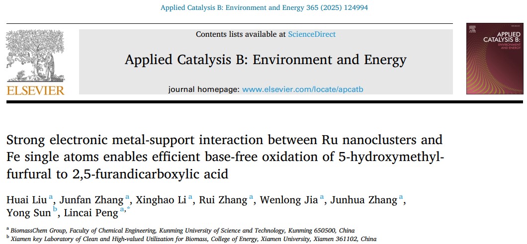 生物质化工团队关于生物质平台化合物5-羟甲基糠醛催化氧化制备聚酯单体2,5-呋喃二甲酸方面取得创新突破。相关研究成果以“Strong electronic metal-support interaction between Ru nanoclusters and Fe single atoms enables efficient base-free oxidation of 5-hydroxymethylfurfural to 2,5-furandicarboxylic acid”为题发表在环境与能源领域国际权威TOP学术期刊《Applied Catalysis B: Environment and Energy》上(IF=20.2)。星力