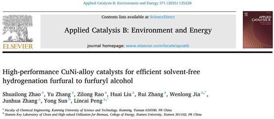 生物质化工团队在半纤维素基糠醛催化加氢制备糠醇方面取得重要研究进展,实现了无溶剂条件下糠醛的高效选择性加氢。相关研究成果以“High-performance CuNi-alloy catalysts for efficient solvent-free hydrogenation furfural to furfuryl alcohol”为题发表在环境与能源领域国际权威TOP期刊《Applied Catalysis B: Environment and Energy》上(IF=20.2)。星力