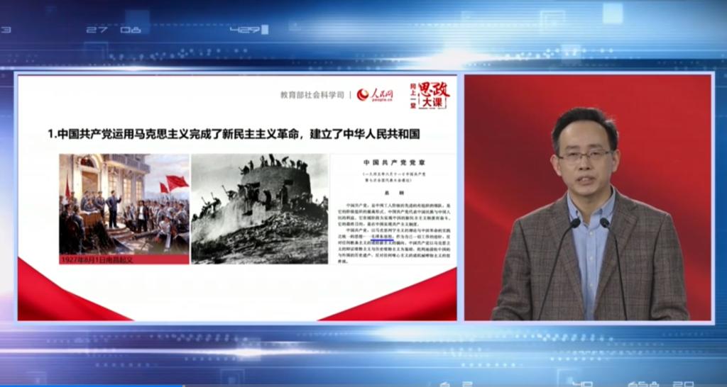 本次课程由教育部社会科学司联合人民网共同举办,课程由北京师范大学赵朝峰、武汉大学卢勇、南京航空航天大学何畏等三位老师主讲,课程从“马克思主义与中国共产党的百年辉煌”、“中国共产党与中华民族的伟大复兴”、“中国共产党革命精神形成与传承的百年历程”三个方面,带领同学们学习了中国共产党成立来的百年光辉历程。