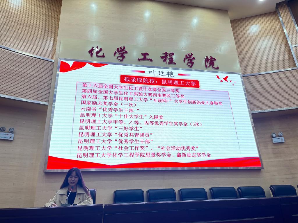 接下来是已获得2023届推免资格的陈首年、王梦新、赵龙琰、叶延艳4位同志先后分享了自己的大学学习经验以及推免相关的经验。大屏幕上一行行已获奖项和拟录取院校深深的激励着全体成员。