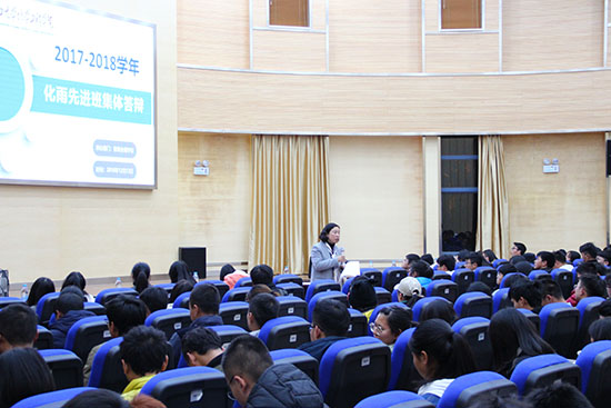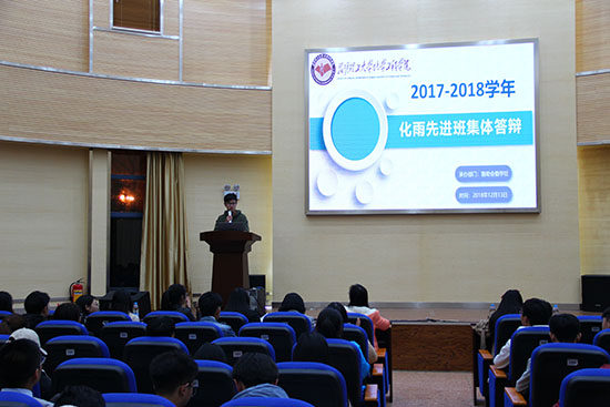 2018年12月13日晚上19:00,化雨先进班集体推荐考评会于化工楼100报告厅正式拉开帷幕。党委副书记李云燕老师,团委谢丽芬老师,学工办杨欢、罗晓菲老师,星力各年级代表、学生组织代表出任评委,各班班委到达现场进行观摩学习。