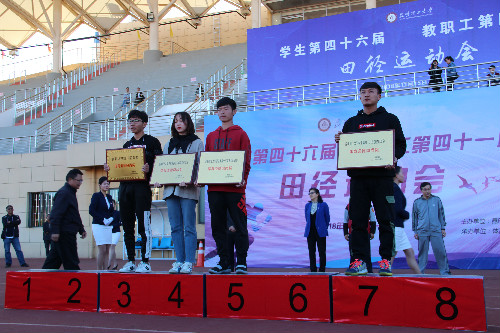 最后是11月17日17:00的闭幕式,由校领导为获奖同学及团体颁发奖项并合照留念。我院获得体育道德风尚奖,以下同学获得优异成绩:和振涛、张志远、马文凯、罗建强四位同学共同获得男子4*100接力赛第七名,何振涛同学获得男子200米第五名,徐忠雕同学获得男子5000米第五名,马丽琼同学获得女子铅球第四名。
