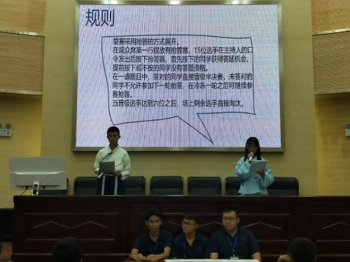 主持人向参赛的同学们详细介绍了比赛规则,随后开展了四轮精彩的比拼,初赛实行举牌回答的方式,复赛抢答,半决赛笔试,决赛实行抢答计分的形式。选手们积极作答,经过激烈的角逐,余沛锦、杨一航、郑钰莹三位同学分别获一、二、三名。最后由李凯宇老师为选手颁奖,并做赛事总结。