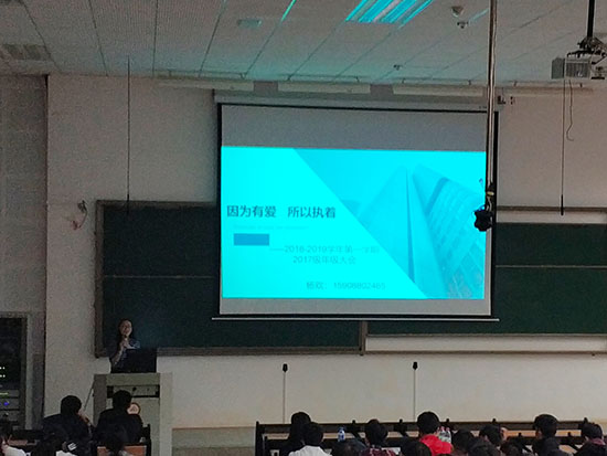 首先杨欢老师介绍自己是2017级新增辅导员。接着进行“因为有爱,所以执着”的主题演讲;关于如何正确度过大学时光,杨欢老师分别从学习、生活、安全三个方面结合自身的大学经历向同学们讲解,并强调了正确度过大学时光的重要性。之后杨欢老师播放了一段关于“如何正确面对大学生活”的相关视频并呼吁大学生要正确的度过大学时光。