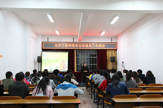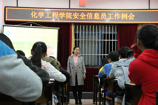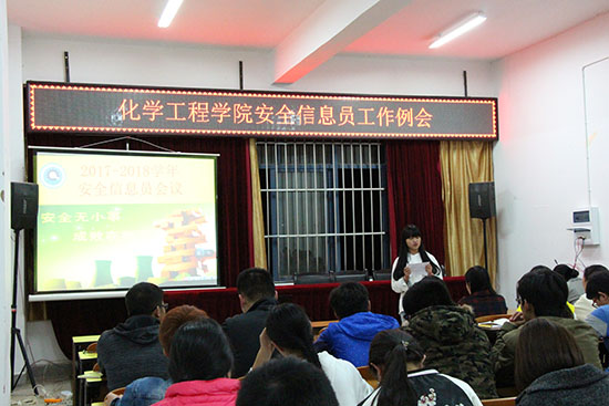 2017年10月30日晚19:00,安全信息员例会在化工楼负一楼报告厅举行。出席本次会议的有院党委副书记李云燕老师、学工办李凯宇老师,此外各年级安全信息员以及勤助会勤工权益部相关工作人员也参与了本次会议。