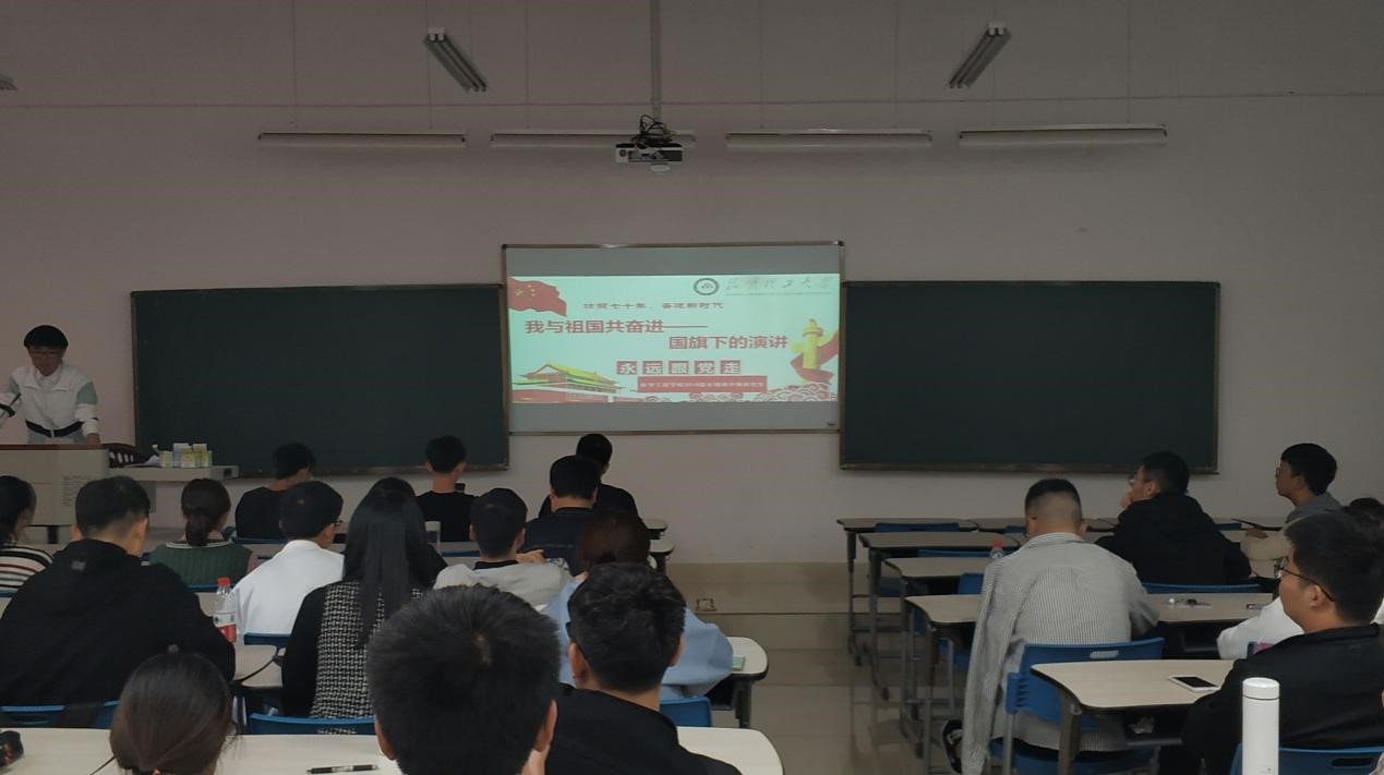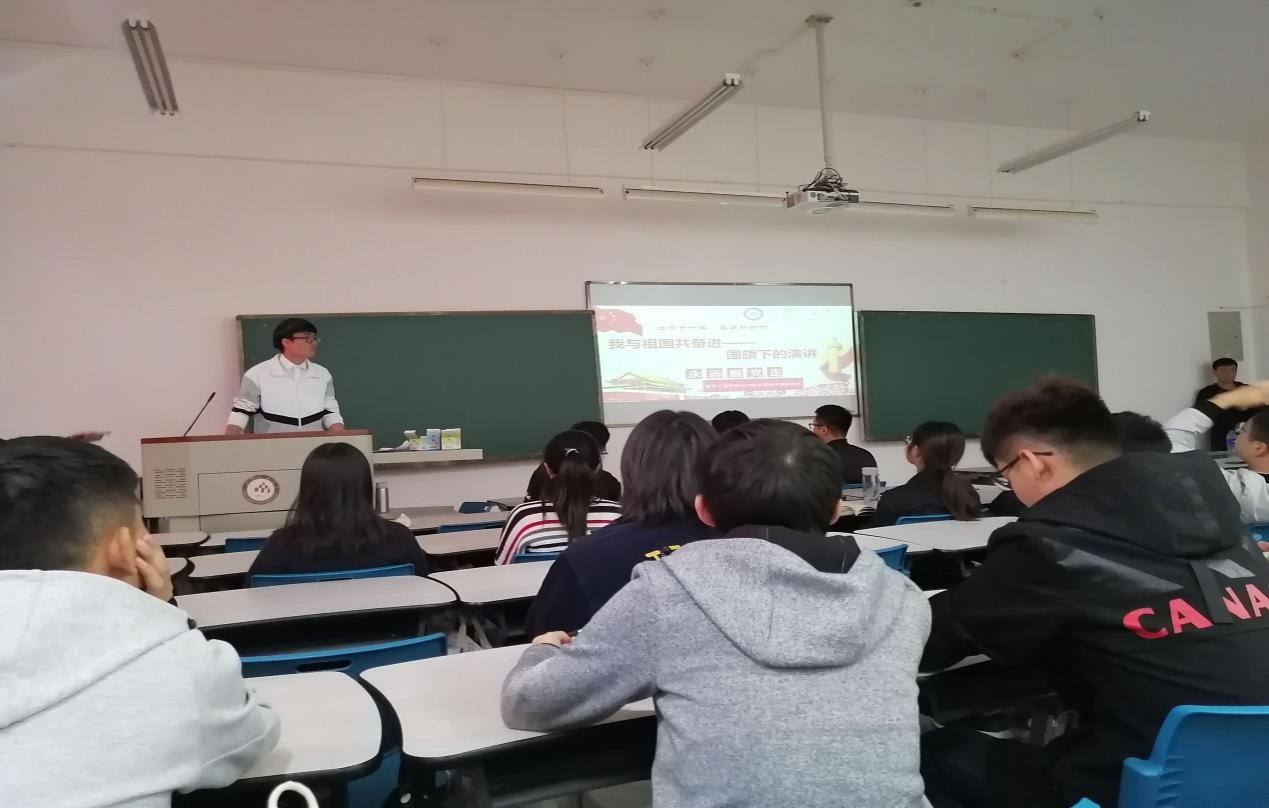 2019级专硕班团支书彭程同学做了演讲,演讲的题目是《七十华诞共喝彩,时代责任齐担当》。彭程同学回顾了我国从经历磨难到繁荣富强的过程,让每一位同学对中国过去的风雨历程有了更深层次的了解。新中国70年的发展进步充分证明,没有共产党就没有新中国,就没有新中国人民的解放,幸福生活和美好未来。青年一代要高举旗帜,继往开来,进一步增强爱党爱国之情,竖定理想信念,增强责任意识,为实现中华民族伟大复兴好好学习,勇于担当,贡献力量。少年强则中国强,我们肩负着继承老一辈光荣革命传统,实现中华民族伟大复兴的历史使命,是祖国的未来,民族的希望;是我们的血脉,我们的继托;是我们心中永远割舍不下的至亲至爱。我们要牢记党和人民的重托,珍惜保贵的时光,树立远大的理想,培养高尚的品德,锻炼键壮的体格和坚强的意志,真正成长为德才兼备有品位,强国兴家有作为的优秀人才。他也表示,会保留那份刻苦拼搏,为祖国建设添砖加瓦,以最饱满的姿态去为伟大的祖国庆生。
