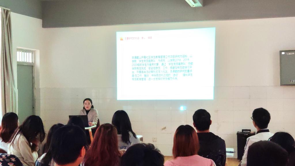 谢丽芬老师首先介绍了以“学生党员服务队”为依托的社区学生教育管理工作研究项目的内容、意义、摘要、拟解决的问题、研究对象的现状、预期目标等情况,简要介绍了前期筹备情况,强调了学生党员服务队与安全信息员的职能职责,并对近期的的工作进行了安排和部署。