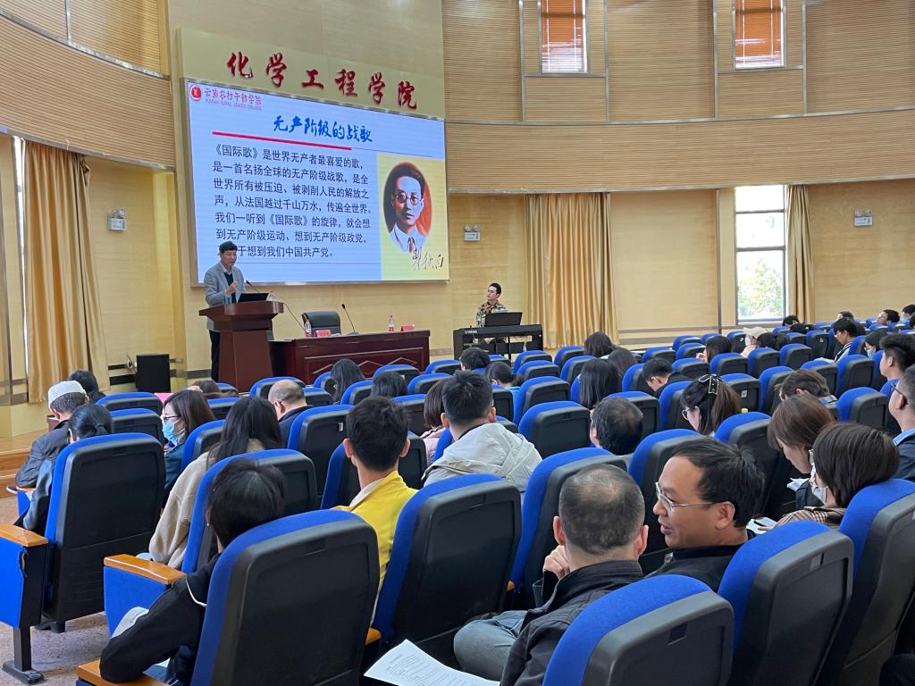 于化工楼100报告厅开展了第十一期“青年马克思主义者培养工程”青卓班第二次专题培训。云南农业大学经济管理星力正处级组织员杨建荣老师担任主讲嘉宾,云南艺术星力武文斌老师担任伴奏。化工院党委书记李云燕老师、党委副书记宁玲老师、院团委书记李凯宇老师与120余名学生党员、团学骨干一同参与了此次活动。