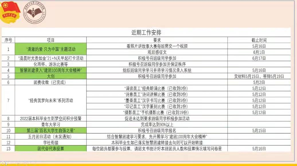 首先由朱芝老师强调了“青年大学习”的重要性,她强调团中央在全团部署实施“ 青年大学习”行动, 突出武装和思想引导, 通过构建“ 导学、讲学、研学、比学、践学、督学“六位一体的学习体系, 着力提升学习的制度化和实效性, 推动党的创新理论深入人心, 引导广大青年坚定不移听党话、跟党走。作为新时代的团员青年更应该主动学习,积极作为,各团支书做好监督引导工作,完成既定学习目标。接下来部分团支书做了工作交流。随后,李凯宇老师强调了近期的重点工作,如团学代会的代表选举、“经典筑梦向未来”的作品申报,“清澈的爱只为中国”的主题活动,毕业班第二课堂积分帮扶,学社衔接相关工作等。