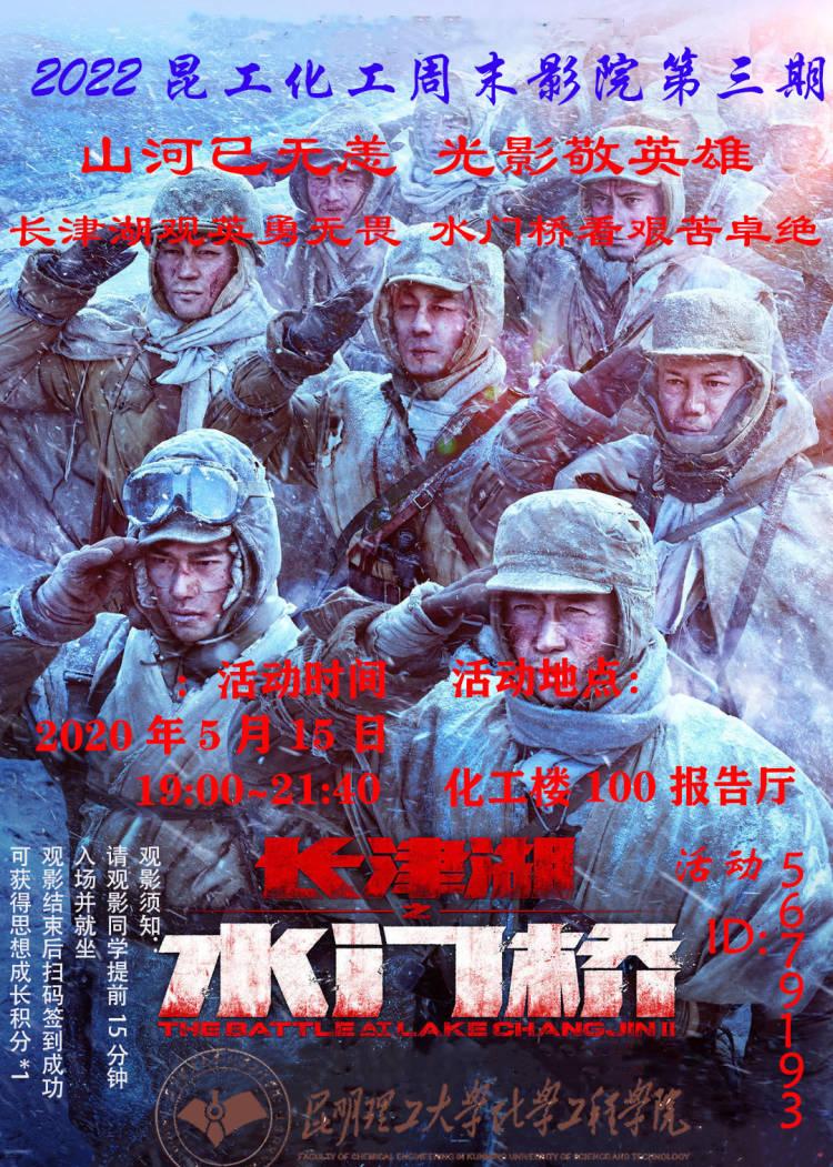 为深入学习习近平总书记在建团百年庆祝大会上的重要讲话精神,传达青春热情,宣扬爱国激情,进一步开展“清澈的爱只为中国”系列活动,我院在周末影院第三期推送了电影《长津湖之水门桥》。在本次活动中,我院以影片的形式向广大青年同胞们传达了先辈烈士们的爱国热情,提醒广大青年同胞勿忘历史,牢记使命,不负自己的美好青春,勇敢去奋斗拼搏未来。
