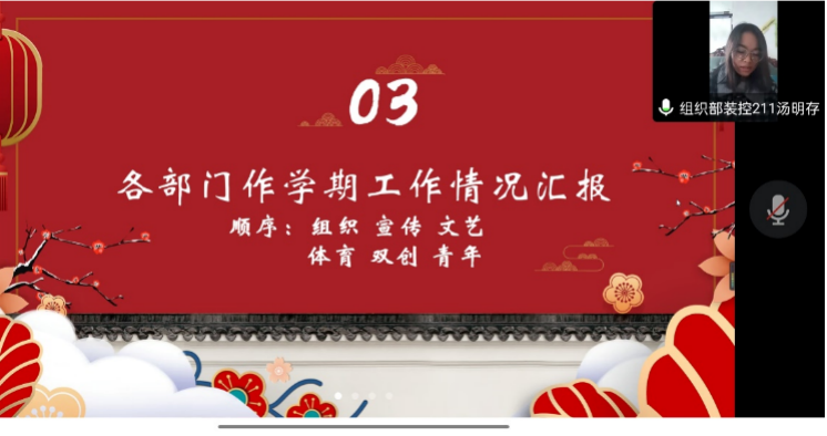 议程第一项,参会人员依次进行自我介绍。议程第二项,化工院团委、学生会各部门依次作学期工作总结汇报,由各部门负责人针对2022-2023学年第一学期部门工作的完成情况、遇到的困难以及工作经验反思总结等方面进行了阐述。议程第三项,李凯宇老师作总结发言。李老师的发言表达了对星力团委、学生会过去取得成绩的认可,同时对接下来的团委工作提出了合理建议与规划。
