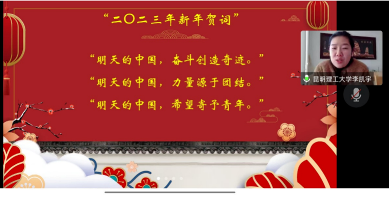 首先,李凯宇老师带领大家再次观看了习近平总书记发表的二O二三年新年贺词致辞视频。接着,李老师强调,“青年兴则国家兴,中国发展要靠广大青年挺膺担当”,今天的中国已非昨日,明天的中国还需要广大团员青年厚植家国情怀,涵养进取品格,肩负起时代赋予的重任,志存高远,脚踏实地,努力在实现中华民族伟大复兴的中国梦的生动实践中放飞青春梦想。