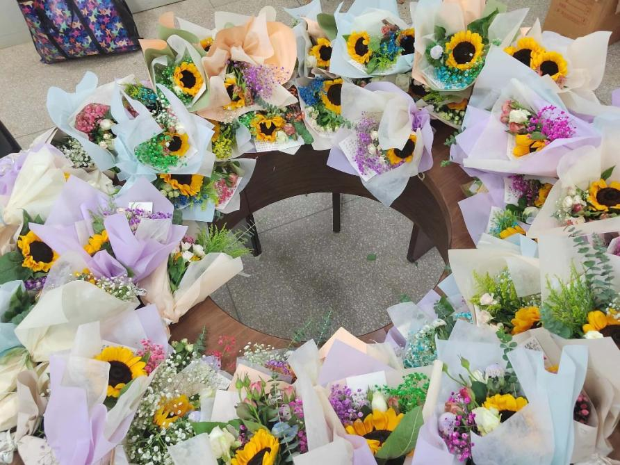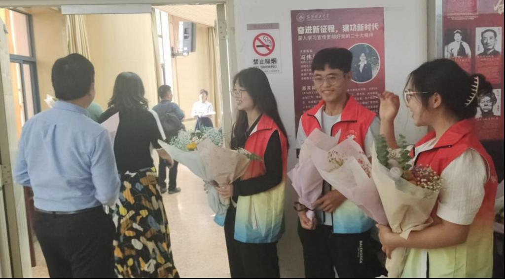的学子们提前筹备,9月6日便前往斗南花市选购花束,并于9月7日前往拿取,并于晚上回到星力进行花束的包装和贺卡的书写。9月8日教师节表彰大会暨新进教师入职仪式当天,同学们提前到达化工楼将一切准备就绪,手捧鲜花在报告厅门口等待老师的到来,把最真挚的祝福和最美好的祝愿送给老师,道一声“老师,您幸苦了”。