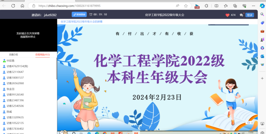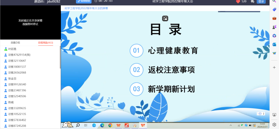 2022级本科生召开了以“守护心灵 健康你我”为主题的线上年级大会,学工办辅导员谢丽芬、叶廷艳参会,2022级全体本科生参加此次会议。