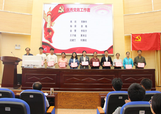 委员会关于表彰2017-2018学年优秀共产党员、优秀党务工作者的决定》,并希望受表彰的同志戒骄戒躁,继续充分发挥优秀共产党员的表率作用。毛文元等4位教师共产党员、陆俊凤等12位学生共产党员、高欣等10名党务工作者受到表彰。党委委员李斌、贾庆明同志为他们颁奖。