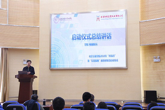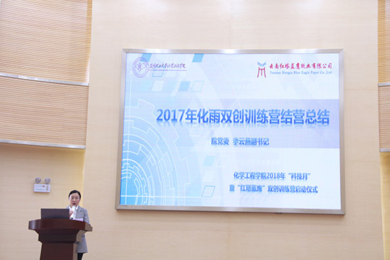 2018年4月12日下午13:30, 2018年“科技月”暨红塔蓝鹰双创训练营启动仪式在化工楼100报告厅顺利拉开帷幕。云南红塔蓝鹰纸业有限公司朱自忠总经理、院党委齐毅书记、梅毅院长、院党委李云燕副书记、生物质工程系系主任彭林才老师、生物质工程系朱正良老师、星力科研秘书张恒老师莅临现场与训练营营员们共同参与活动。