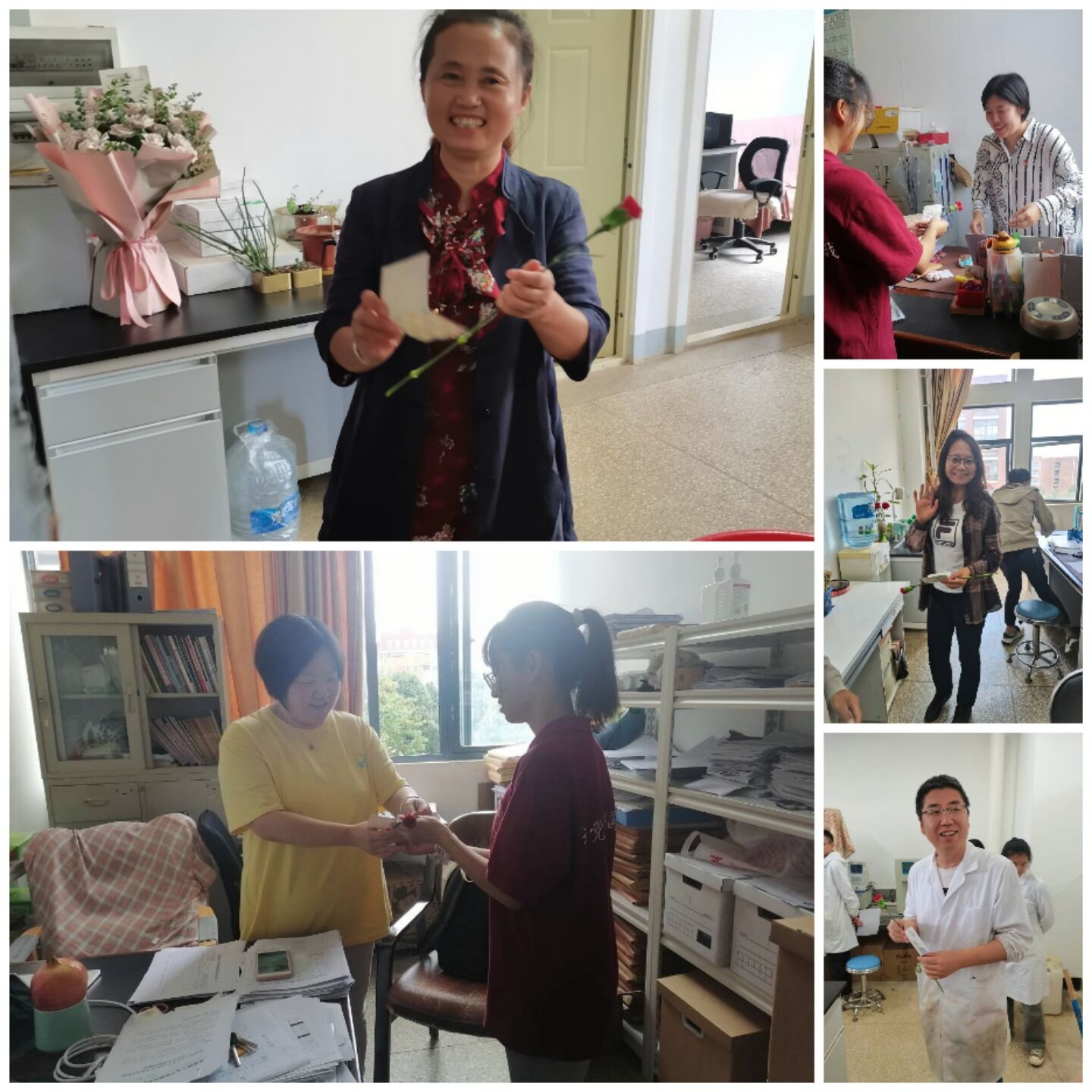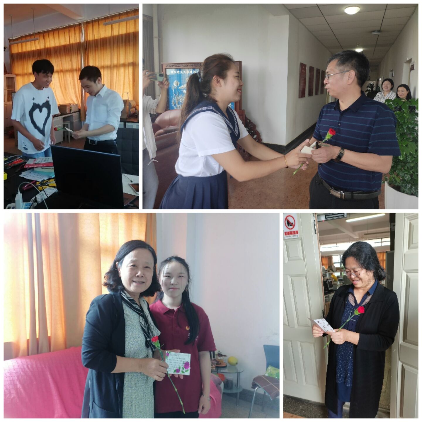 活动中,同学们核对了每一位老师的工作室,将对应姓名的贺卡和鲜花准确送达老师手中并拍照留念。