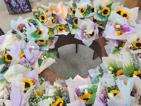 在场的同学为老师献上鲜花。这些鲜花都是同学们一束束配花扎花,并一笔一划写下感念师恩的祝福语,表达了同学们对老师的感激之情。