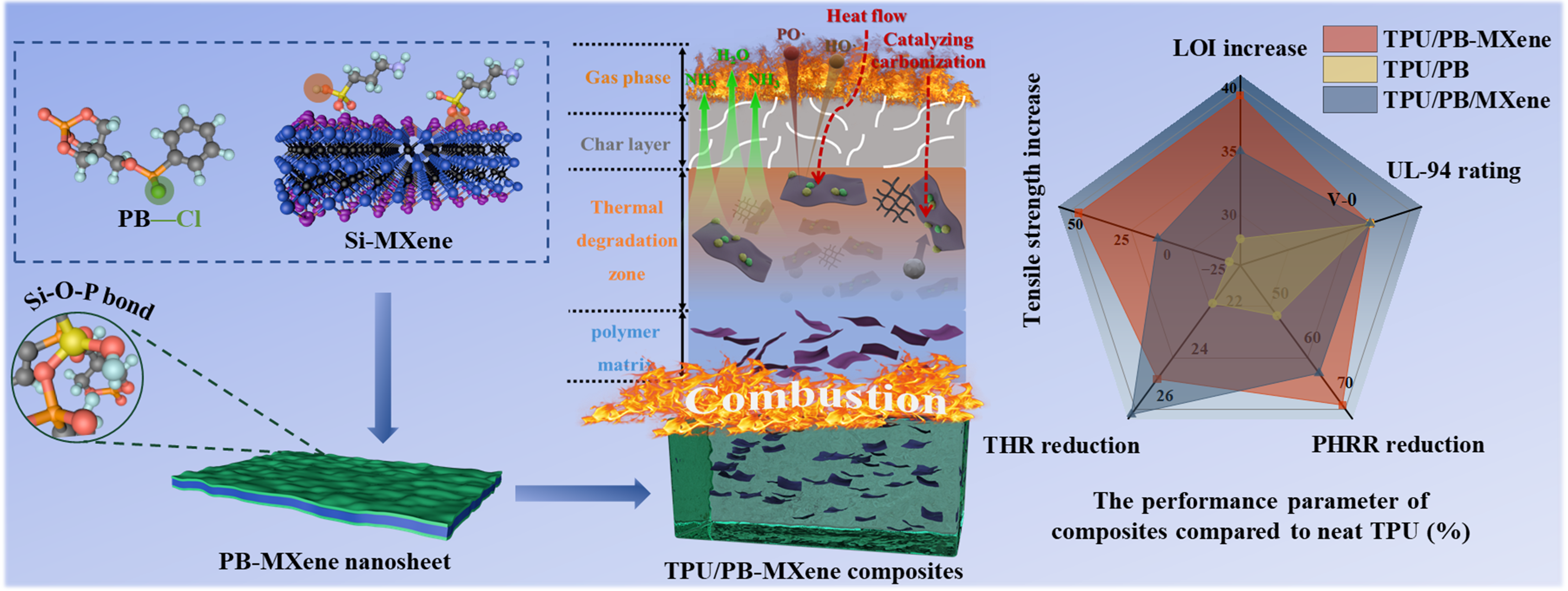 磷化工团队通过合理设计阻燃剂结构,充分利用了MXene二维材料高纵横比的结构和丰富的表面官能团,在MXene表面接枝了15倍自身质量的有机磷化合物(PEPA-BPOD),成功制备了高效协同阻燃剂(PB-MXene);并以PB-MXene为阻燃功能填料,在复合材料仅含有质量分数0.5%的MXene情况下,实现了热塑性聚氨酯(TPU)基材V-0级别和32.2%高LOI值的提升。此外,结合热重、热重-红外联用、SEM、XPS等分析测试方法,重点研究了有机磷与MXene在不同复合条件下,对复合材料燃烧的相关产物结构对比,明确了PB-MXene在聚合物基材燃烧过程中发挥的协效阻燃机制,包括PB对Ti3C2TX片层结构的保护机制、Ti3C2TX与PB的协同催化成炭机制等。该研究进一步明确了有机磷系改性MXene体系的协同阻燃机制,为MXene基高效阻燃体系的设计,尤其是高接枝量的MXene基阻燃体系的设计提供更好的理论指导。