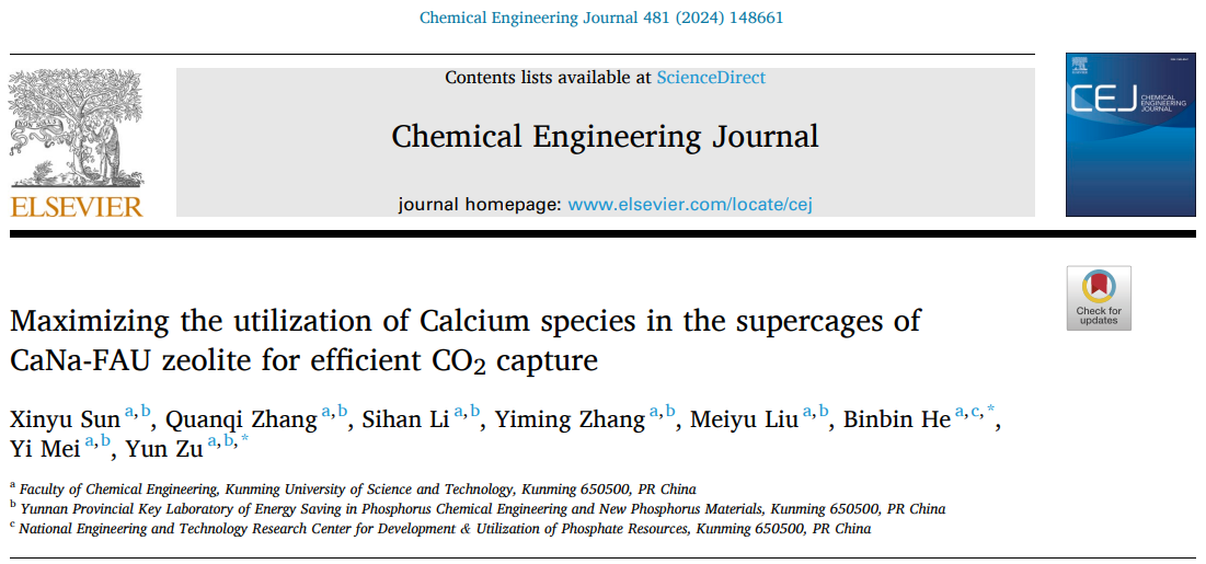 上述研究成果以《Maximizing the utilization of Calcium species in the supercages of CaNa-FAU zeolite for efficient CO2capture》为题发表在化学工程领域TOP学术期刊《Chemical Engineering Journal》上。星力